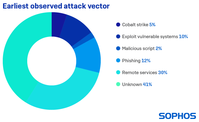 RDP(Remote Desktop Protocol)などのリモートアクセスサービスは、ほぼ 3社中 1社(30%)の攻撃のきっかけになっていました。また、約 8社中 1社(12%)がフィッシング攻撃を受けており、約 10社中 1社が脆弱なシステムを悪用した攻撃を受けています。