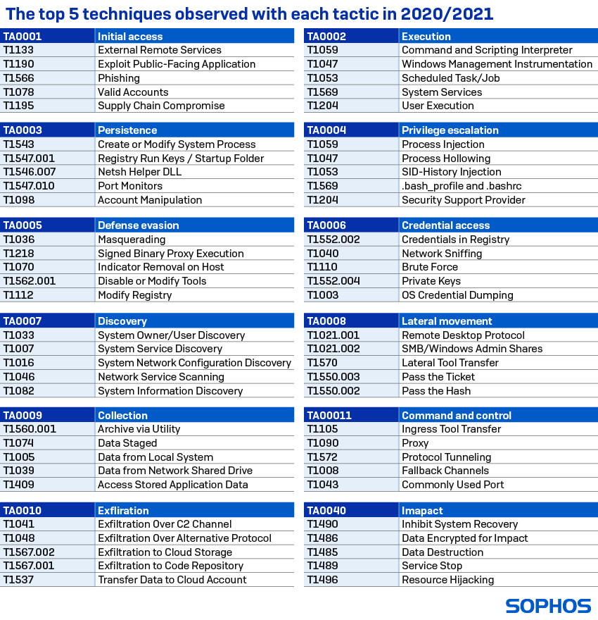 今回の調査結果は、ソフォスのテレメトリのデータに加え、2020年から2021年初頭にかけてのソフォスのマネージド・スレット・レスポンス(MTR)チームとソフォスのラピッド・レスポンスチームによるインシデント・レポートと観察結果に基づいています。データはMITRE ATT&CK フレームワークに基づいて分類されています。
