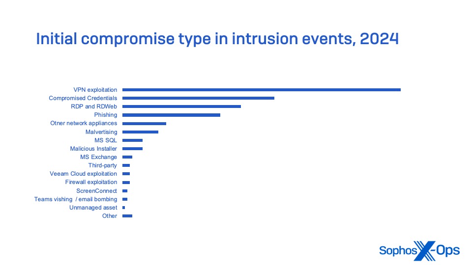 特に、仮想プライベートネットワーク (VPN) アプライアンス、VPN 機能付きファイアウォール、その他のリモートアクセスアプライアンスなどのネットワークエッジデバイスは、サイバー犯罪インシデントの主な原因となっています。これらのデバイスは、Sophos MDR が追跡した侵入インシデントにおいて、ネットワークの初期侵害における最大の原因となっています。