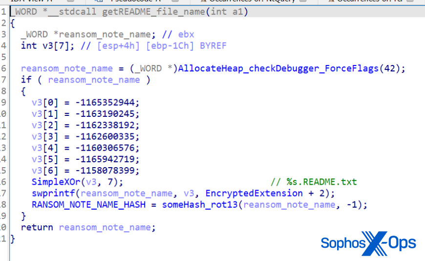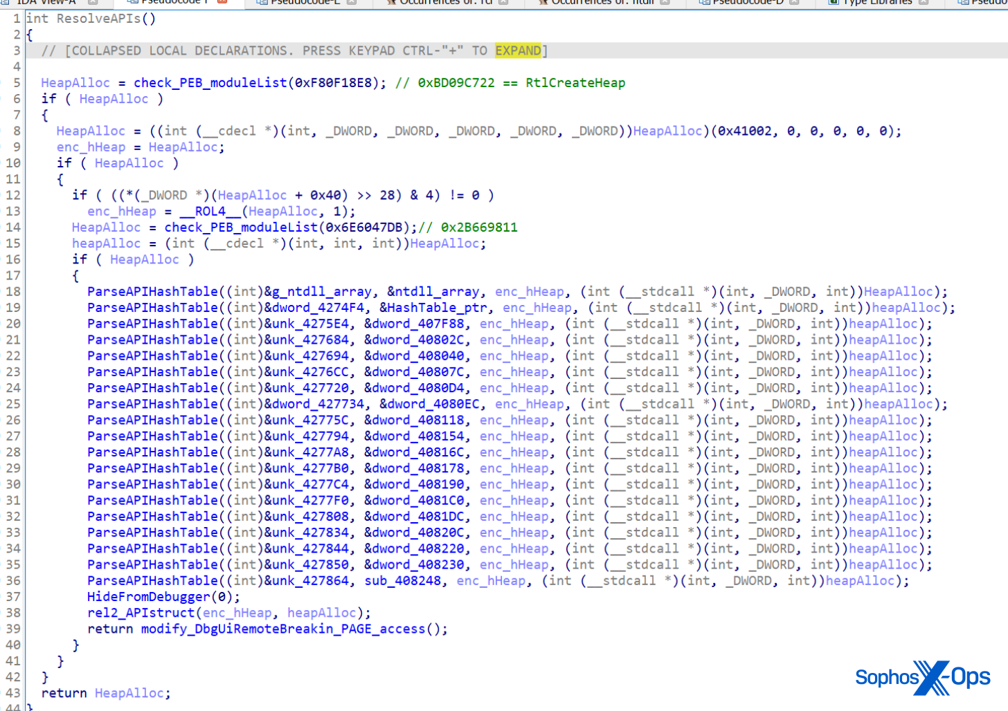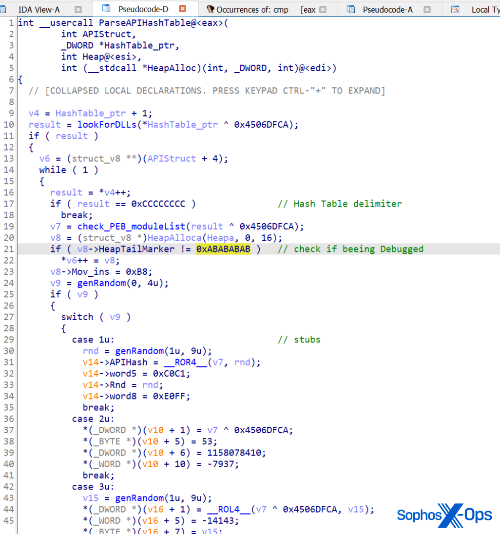It will try to get pointers from the functions it needs by searching the PEB (Process Environment Block) of the module. It will then look for a specific binary data marker in the code (0xABABABAB) at the end of the heap; if it finds this marker, it means someone is debugging the code, and it doesn’t save the pointer, so the ransomware quits.