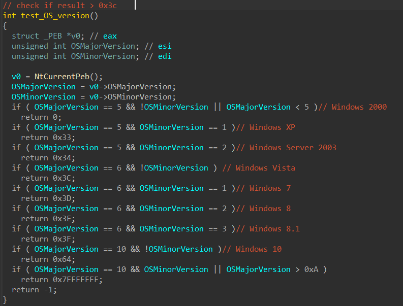 Both ransomware strains use identical code to check the OS version – even using the same return codes (although this is a natural choice, since the return codes are hexadecimal representations of the version number).