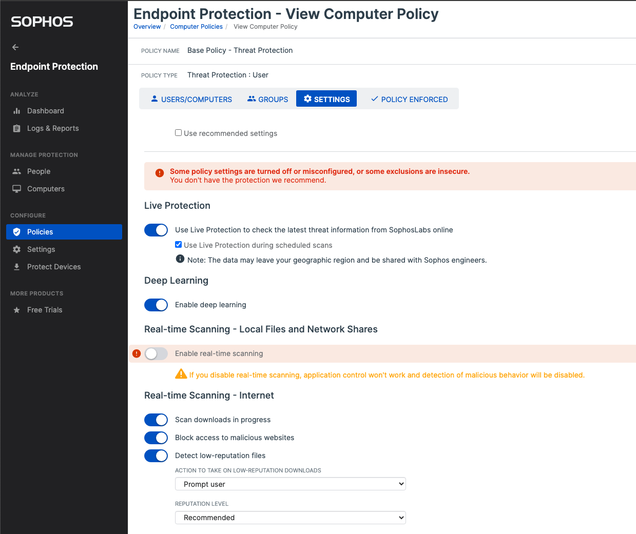 - Política de ameaças – as políticas estão usando as configurações recomendadas da Sophos?