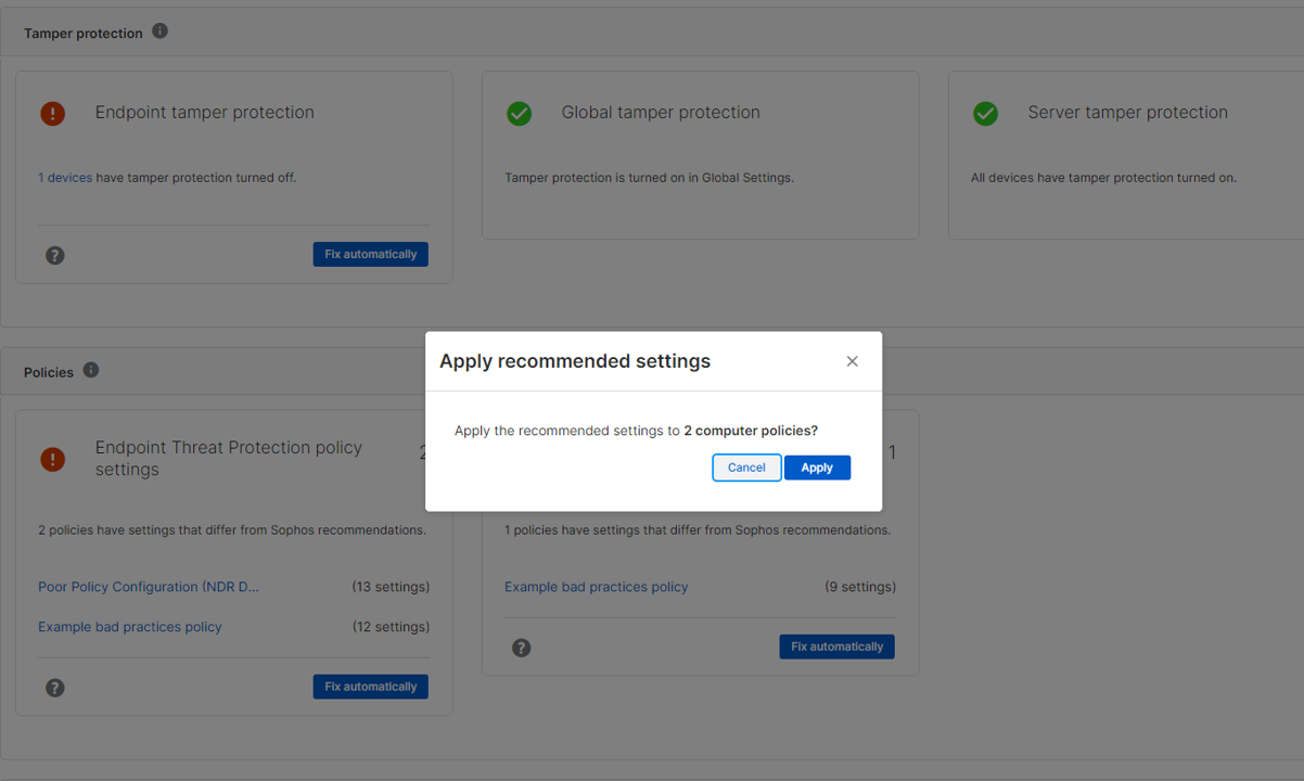 Embora as configurações recomendadas sejam aplicadas automaticamente a todas as novas implantações da Sophos, com o tempo podem surgir problemas à medida que os dispositivos são adicionados e removidos, os membros da equipe mudam e diferentes assinaturas de software são adquiridas. Recomendamos revisar a verificação de integridade da conta pelo menos a cada três meses – e idealmente mensalmente – para manter um ambiente saudável.