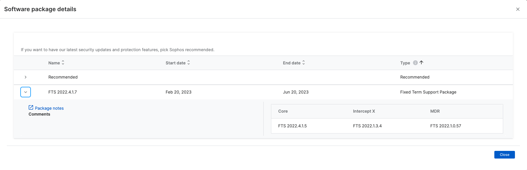 Os pacotes de suporte de prazo fixo permitem que os clientes controlem com precisão quais versões do software Sophos Endpoint eles implantam em dispositivos/grupos específicos de dispositivos Windows. Isso permite que você controle quando os dispositivos são atualizados em vez de estarem no cronograma de atualização do Sophos.